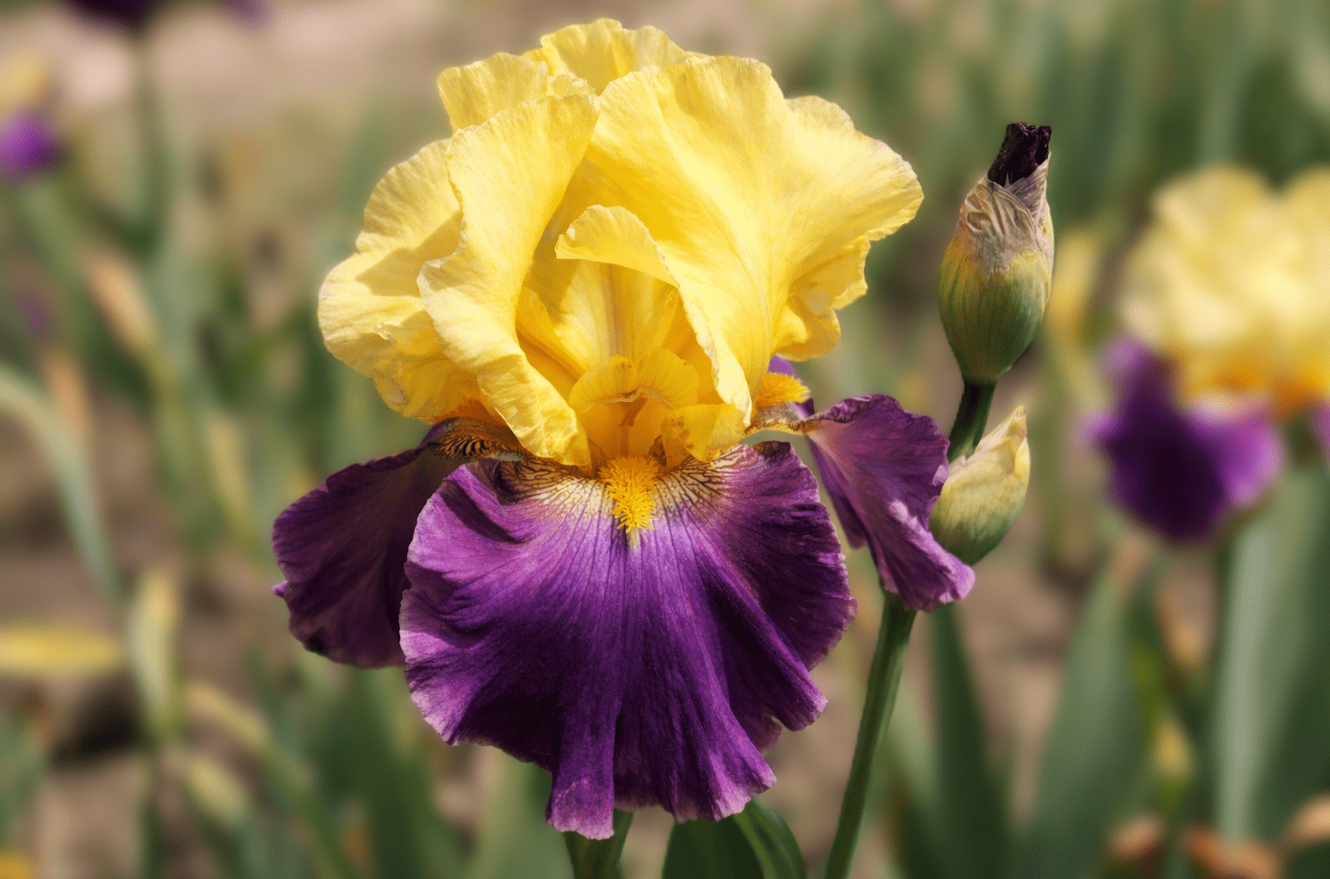 The Island Hop Bearded Iris, hybridized by Schreiner in 2018, stands at an impressive height of 36.5 inches. This vibrant midseason bloom features bright lemon yellow standards that radiate warmth and cheer, beautifully contrasted by violet plum falls that add depth and richness to its appearance.