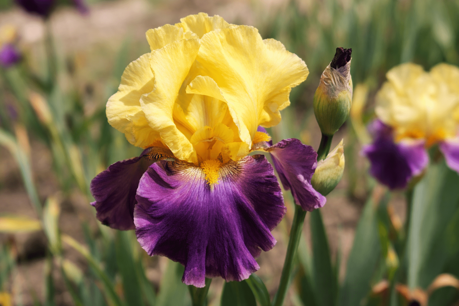 The Island Hop Bearded Iris, hybridized by Schreiner in 2018, stands at an impressive height of 36.5 inches. This vibrant midseason bloom features bright lemon yellow standards that radiate warmth and cheer, beautifully contrasted by violet plum falls that add depth and richness to its appearance.